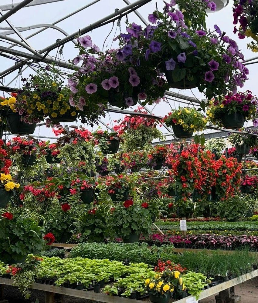Flowers galore! Annuals, perennials, vegetables! Hundreds of thousands of flowering annuals , perennials and vegetables plants. Thousands of hanging baskets and planters home grown on over 10 flowering acres! We also grown 10s of thousands of hardy mums in the fall.